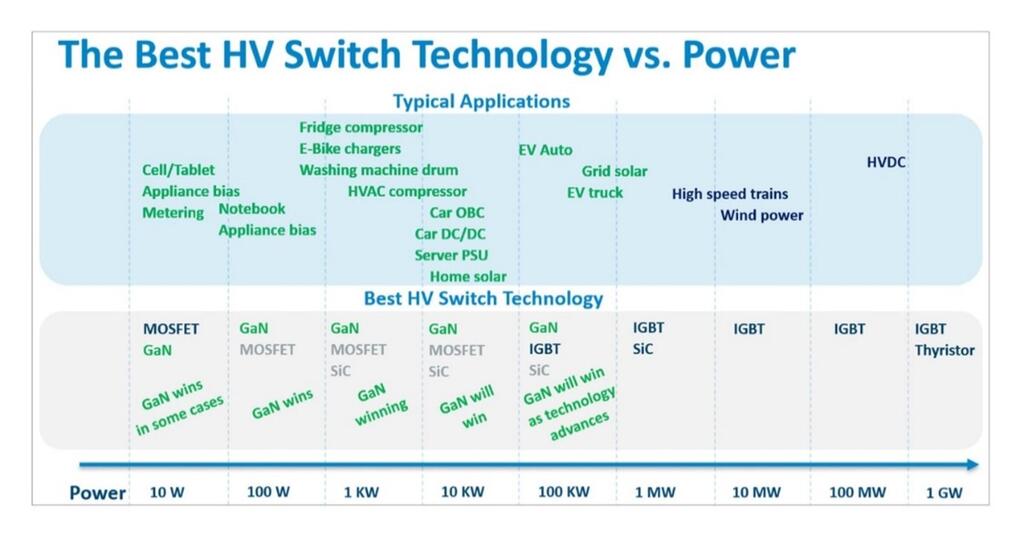 GaN is also scaling to higher power levels, from 500 watts to 10 kilowatts. Applications include e-bike chargers, refrigerators, HVAC compressors, washing machines, solar power systems, automotive on-board chargers, lead-acid battery replacements and server power supplies.