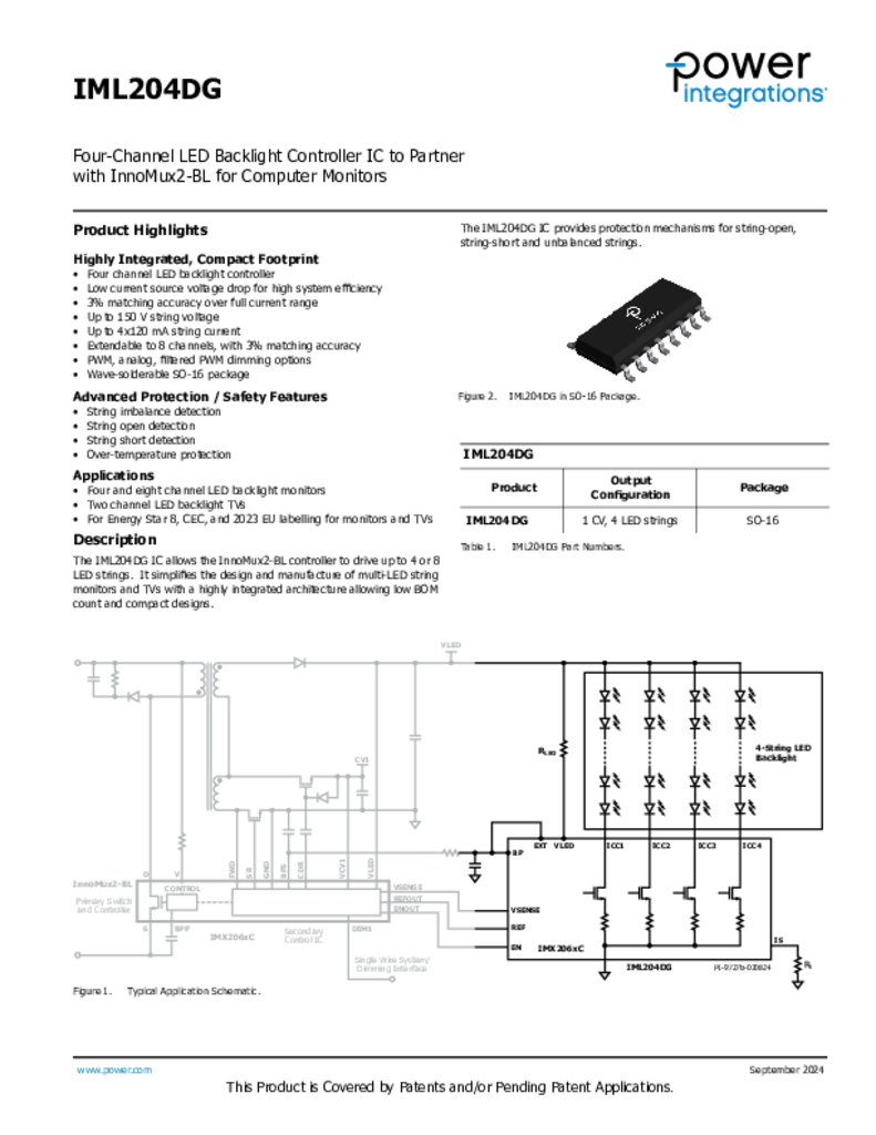 The IML204DG IC allows the InnoMux2-BL controller to drive up to 4 or 8 LED strings. It simplifies the design and manufacture of multi-LED string monitors and TVs with a highly integrated architecture allowing low BOM count and compact designs. IML204DG provides protection mechanisms for string-open, string-short and unbalanced strings.