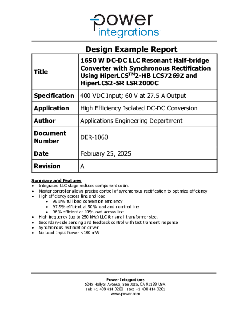 DER-1060 - 1650 W DC-DC LLC Resonant Half-Bridge Converter with SR Using HiperLCS-2 Chipset