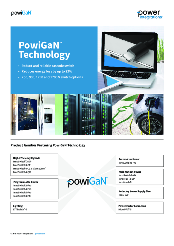 Power Integrations’ internally developed gallium nitride (GaN) technology, PowiGaN achieves up to 95% efficiency across the full load range and up to 100 W in enclosed adapter implementations without requiring a heatsink.