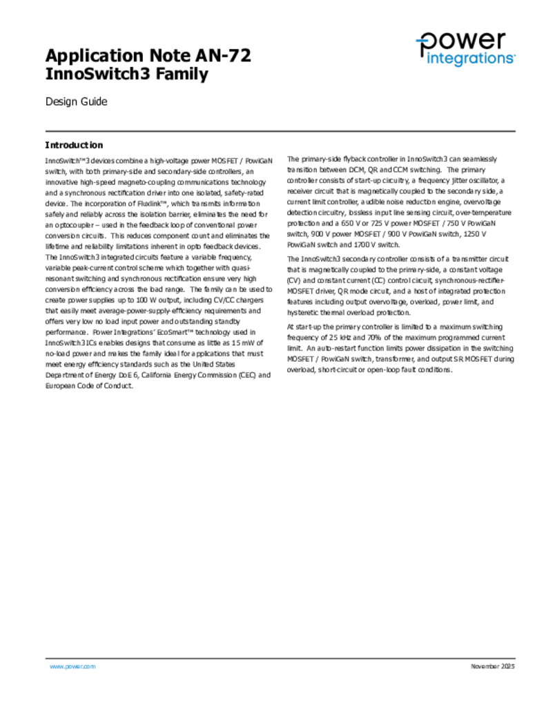 This application note is intended for engineers designing an isolated AC-DC flyback power supply or charger using the InnoSwitch3 family of devices. It provides guidelines to enable an engineer to quickly select key components and also complete a suitable transformer design.