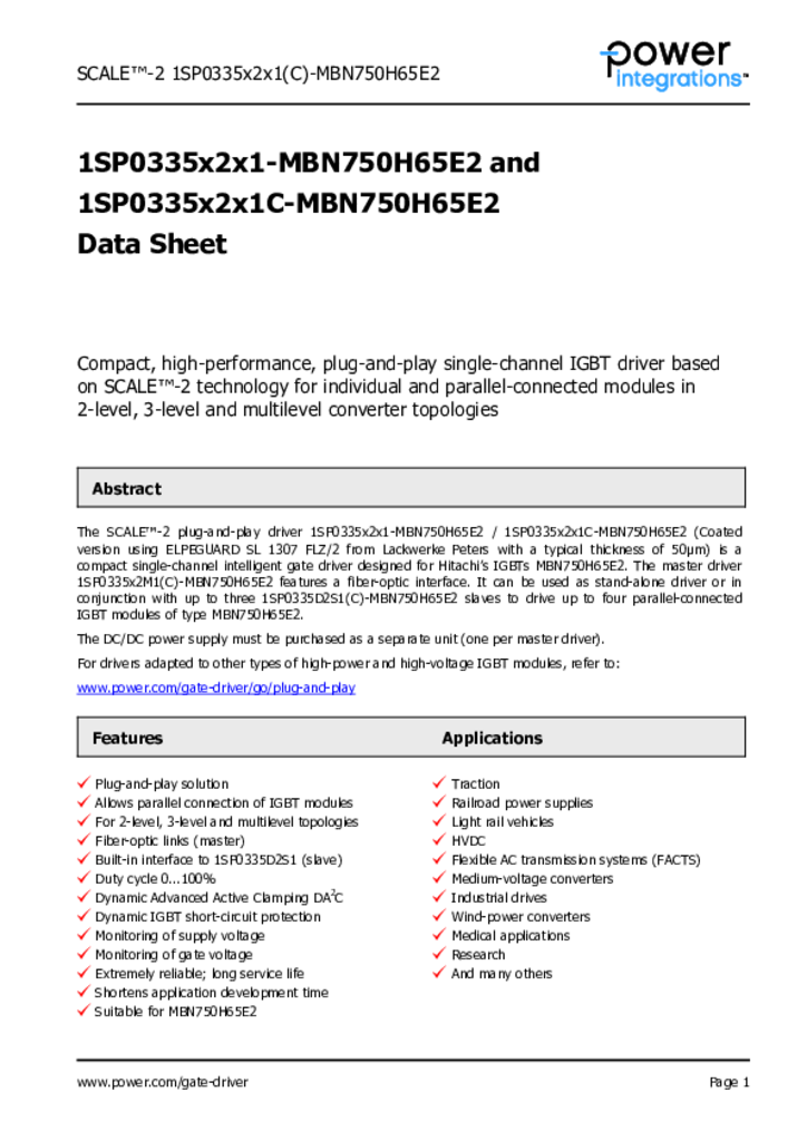 1SP0335x2xx-MBN750H65E2 Data Sheet Single-Channel SCALE-2 Plug-and-Play Driver for IGBTs from 3300 V to 6500 V with external DC/DC Converter 下載 PDF 檢視 PDF Login Required A MyPI account is required to receive email notifications for document updates. Please login or register for an account to continue. Continue × 文件更新請通知我 應用 產品 1SP0335
