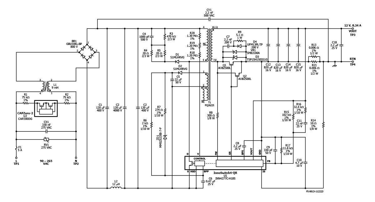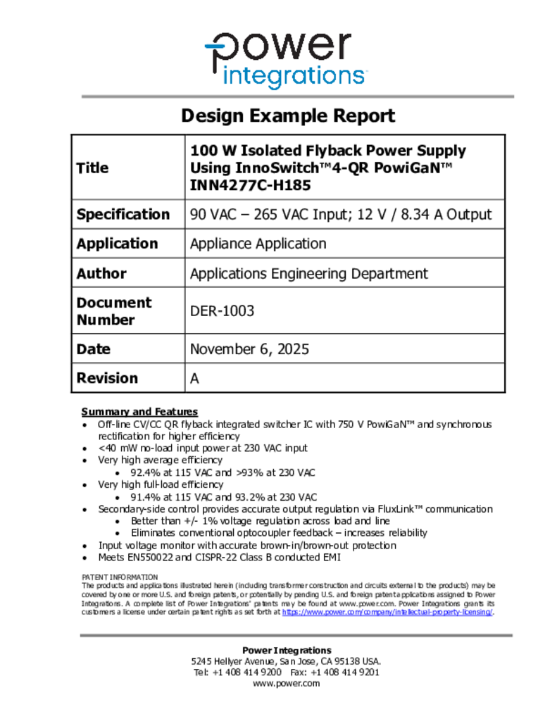 DER-1003 - 100 W Compact Power Supply for Appliances Using InnoSwitch4-QR (750 V PowiGaN)