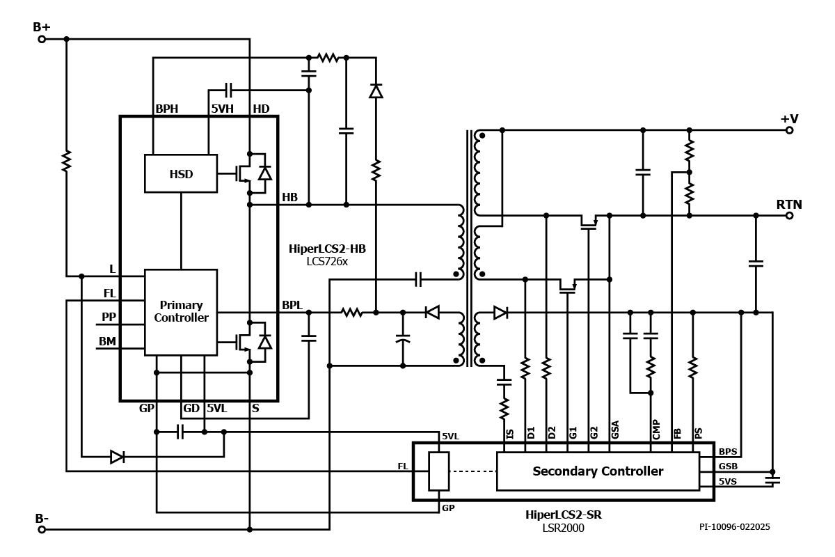 1650 W DC-DC LLC resonant half-bridge converter with synchronous rectification (SR) using HiperLCS2-HB (LCS7269Z) half-bridge power device and HiperLCS2-SR (LSR2000C) safety isolation device