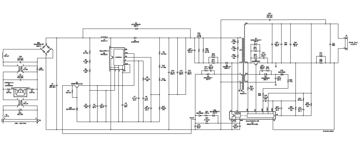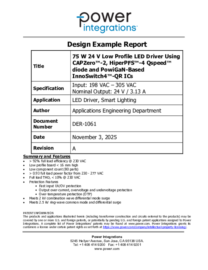 DER-1061 - 75 W Low-Profile LED Driver Using InnoSwitch4-QR (750 V PowiGaN), CAPZero-2 and HiperPFS-4