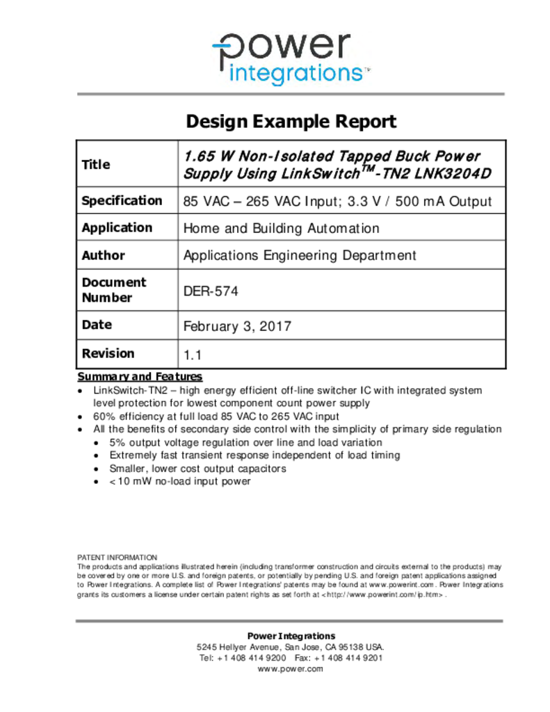 DER-574 - 1.65 W Non-Isolated Tapped Buck Power Supply Download PDF View PDF Login Required A MyPI account is required to receive email notifications for document updates. Please login or register for an account to continue. Continue × Notify Me of Updates Applications Products LinkSwitch-TN2