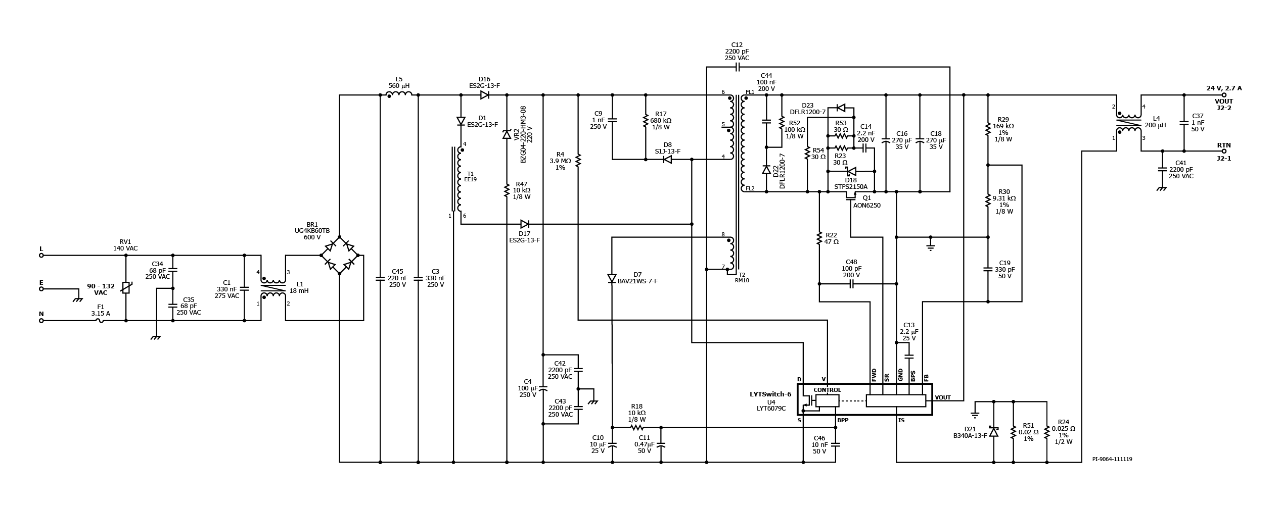 65 W High Power Factor Isolated Flyback with Switched Valley Fill PFC Power Supply using LYTSwitch-6 (LYT6079C) with PowiGaN Technology (90 VAC – 132 VAC Input; 24 V, 2.7 A Output)