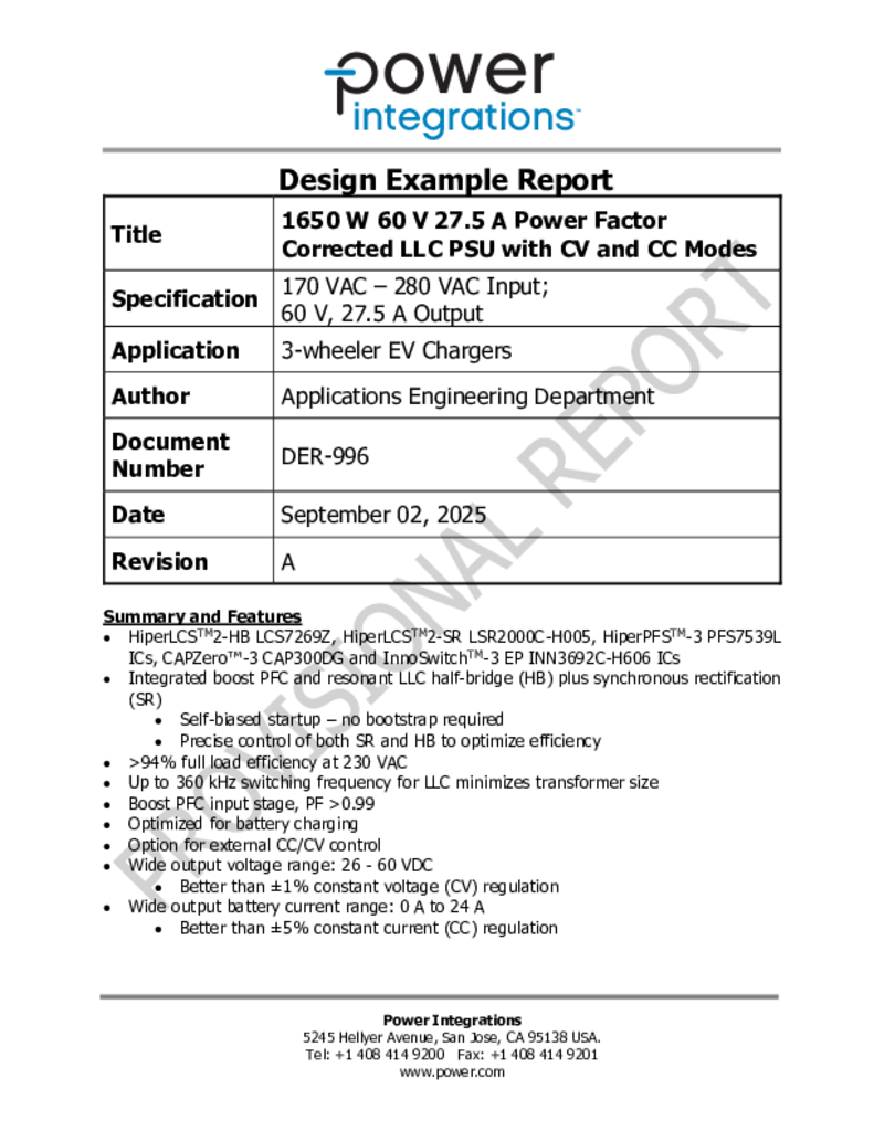 1650 W LLC power supply optimized for compact chargers for electric three-wheelers, high-performance electric motorcycles and power tools, with constant voltage (CV) and constant current (CC) mode control using HiperLCS2-HB (LCS7269Z) half-bridge power device, HiperLCS2-SR (LSR2000C-H005) safety isolation device and HiperPFS-3 (PFS7539L) for power factor correction (PFC)