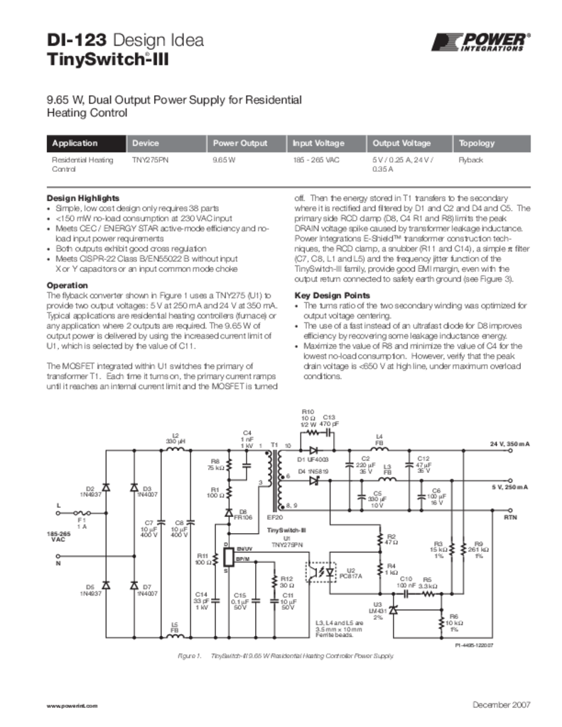 DI-123 - 9.65 W, Dual Output Power Supply for Residential Heating Control