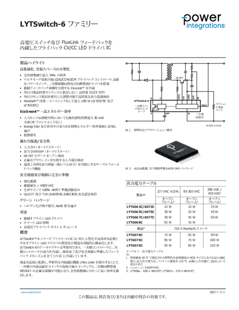 LYTSwitch-6 データ シート 高電圧スイッチ及び FluxLink フィードバックを 内蔵したフライバック CV/CC LED ドライバ IC PDF をダウンロード PDF を表示 Login Required A MyPI account is required to receive email notifications for document updates. Please login or register for an account to continue. Continue × アップデートの通知を受け取る アプリケーション 製品 LYTSwitch-6