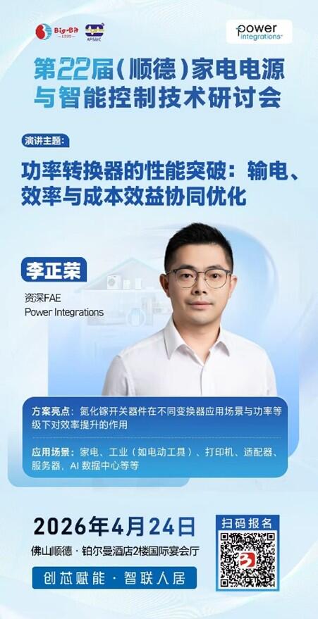 家电智能化趋势加深,家电芯片更加注重智能化、集成化。智能控制与变频驱动控制的技术随着市场需求提高。请参加大比特资讯主办的第22届(顺德)家电电源及智能控制技术创新研讨会。PI技术专家将为您带来最新的智能家电电源解决方案,协助您提升系统效率及可靠性,在增加功能的同时符合最严格的节能标准。