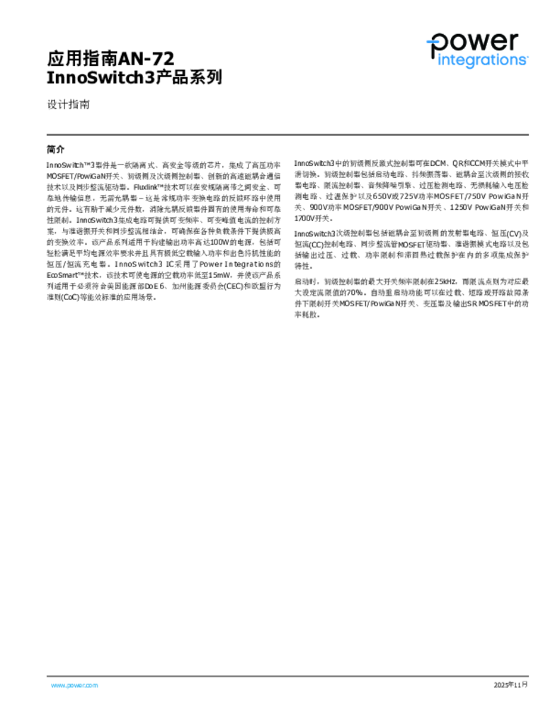 AN-72 - InnoSwitch3 系列设计指南 InnoSwitch3 器件将高压功率 MOSFET / PowiGaN 开关、初级侧和次级侧控制器、创新型高速磁耦合通信技术以及同步整流驱动器集成于一款隔离型、符合安全认证的器件中。 本应用指南旨在帮助工程师使用InnoSwitch3系列器件设计AC-DC隔离反 激式电源或充电器。工程师可以利用本文所述的指导方法快速选择所需 的关键元件并完成合适的变压器设计。 为了简化设计过程,本应用指南直接引用了 PI Expert 设计软件中的 PIXls Designer 电子表格。 下载PDF 查看PDF Login Required A MyPI account is required to receive email notifications for document updates. Please login or register for an account to continue. Continue × 文件更新请通知我 产品 InnoSwitch3-CE InnoSwitch3-CP InnoSwitch3-EP